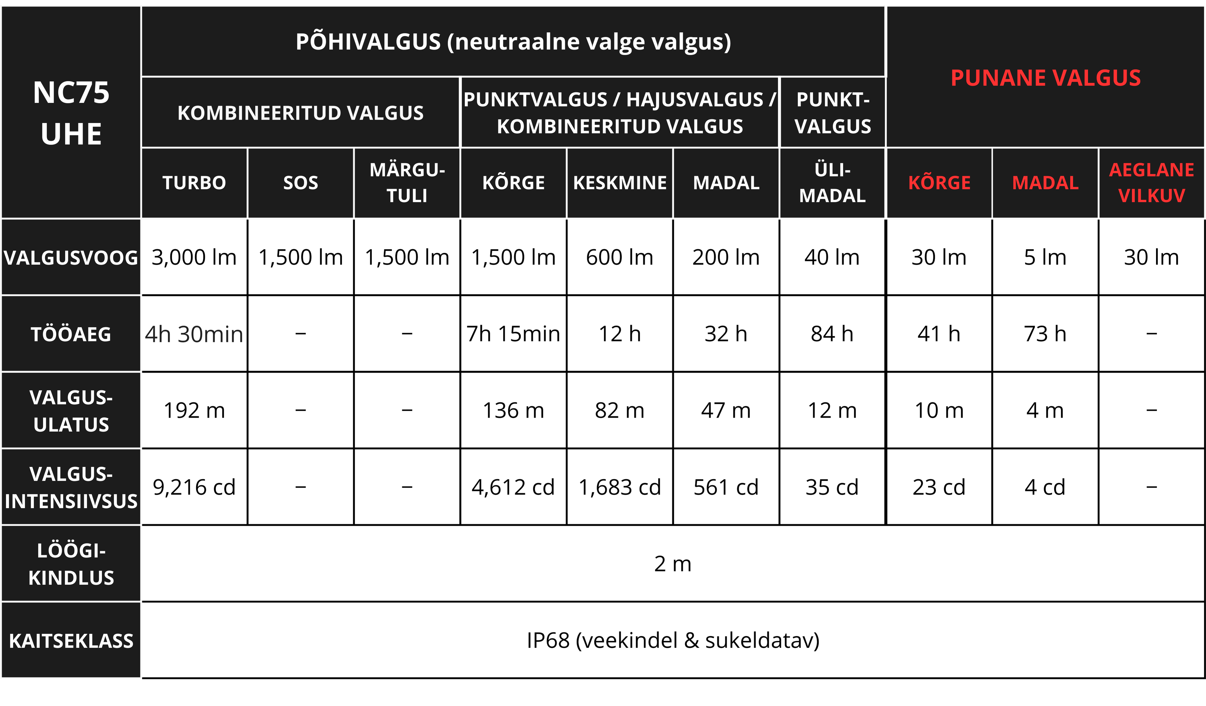 HC75 UHE on suure valgusvõimsusega pealamp, mis on loodud kasutamiseks nõudlikes välitingimustes. 32-tuumaline NiteLab UHE LED-süsteem annab kuni 3,000 luumenit valgusvoogu ning valgustab laia ja ühtlase valgusvihuga nii lähedal kui ka kaugemal asuvaid objekte.
