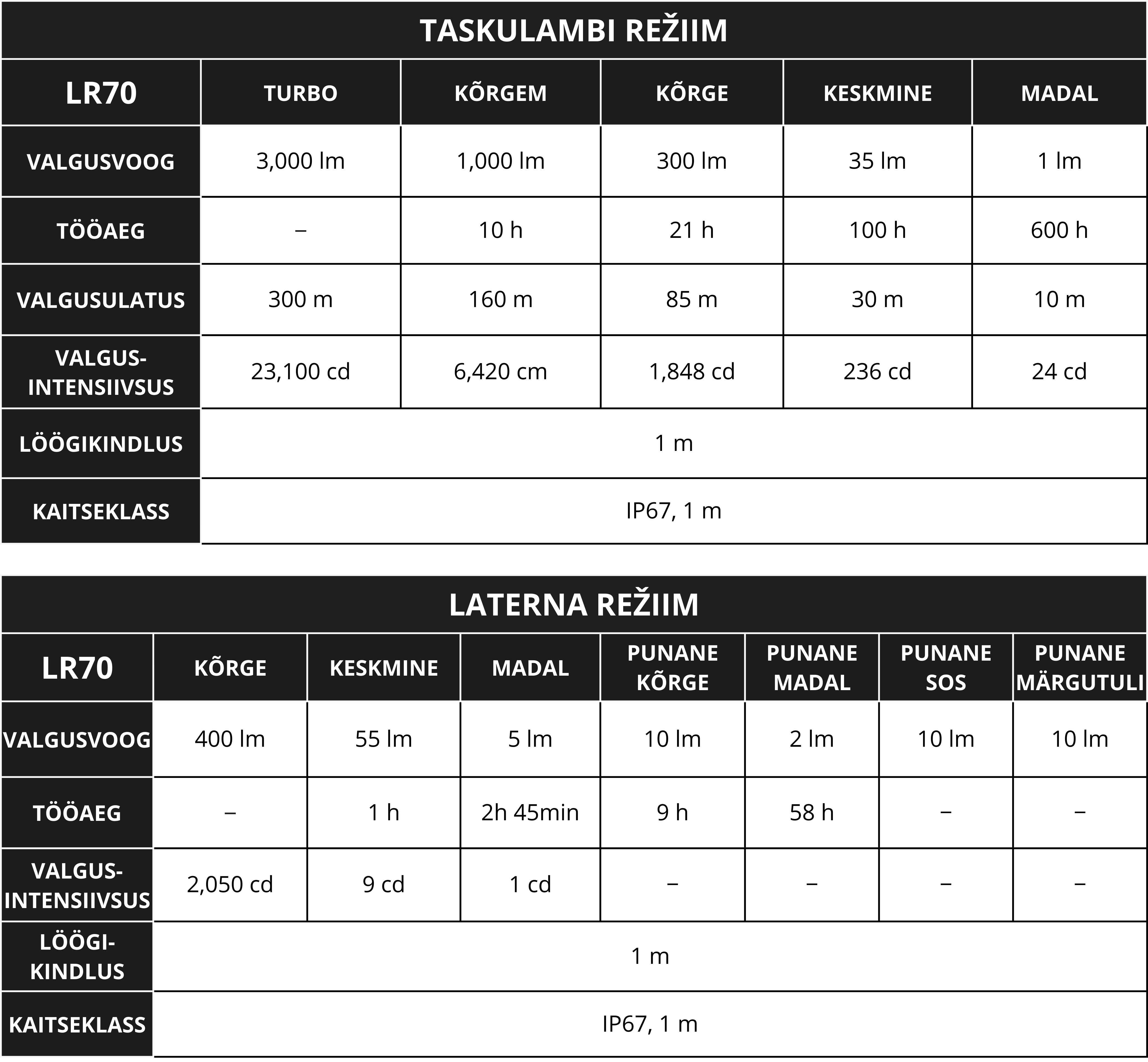 • Valgusintensiivsus: 23,100 cd (taskulamp) / 70 cd (latern);