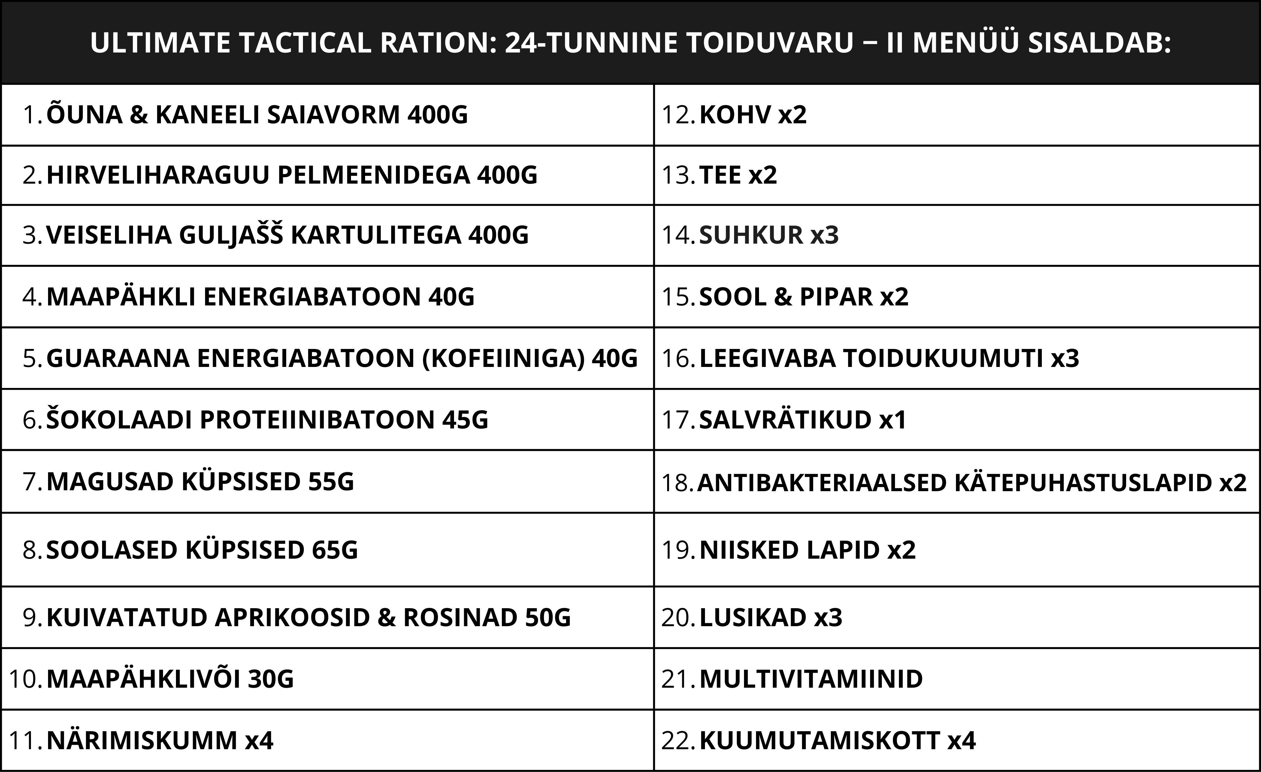 ULTIMATE TACTICAL RATION: 24-TUNNINE TOIDUVARU - MENÜÜ II