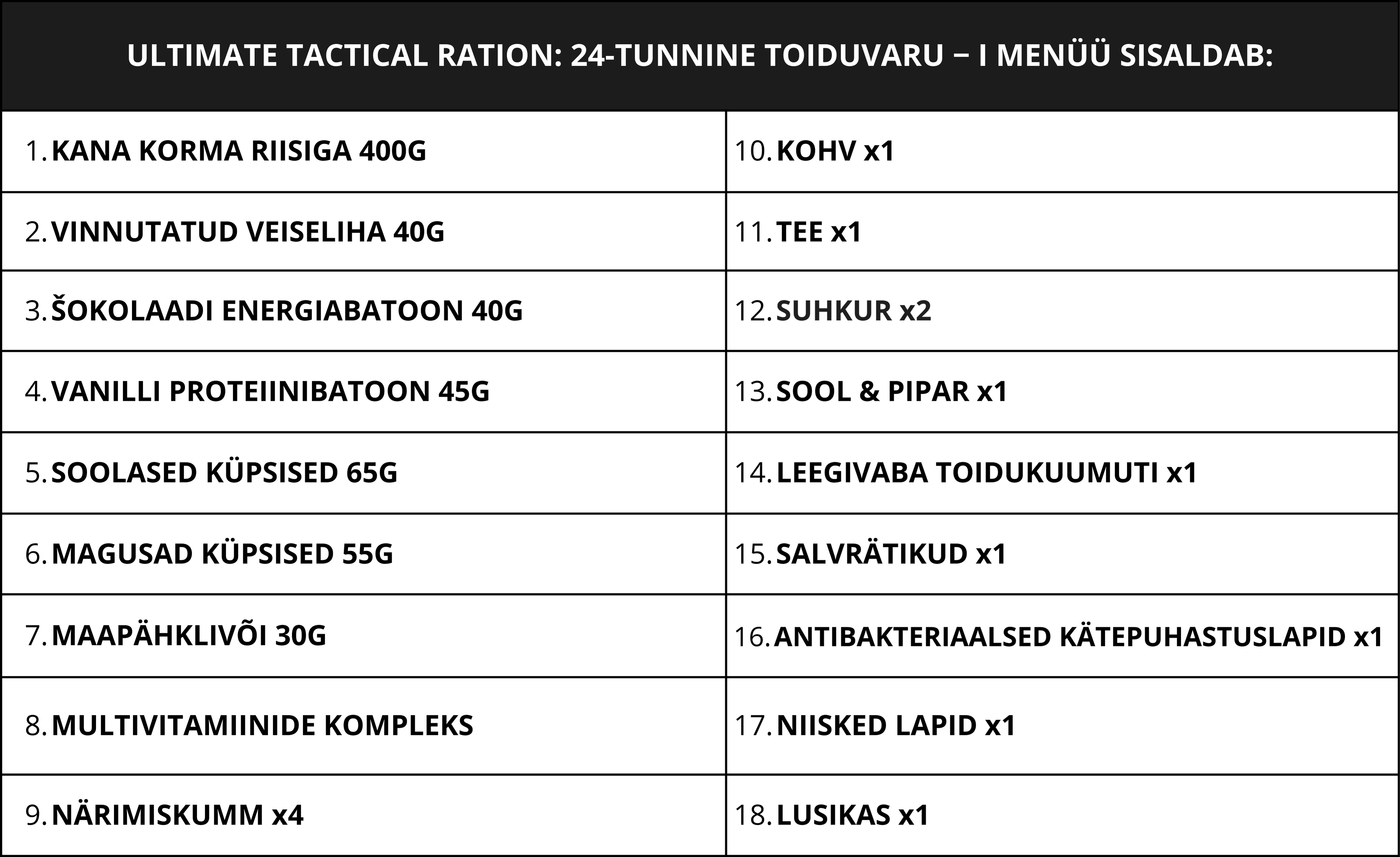 ULTIMATE TACTICAL RATION: POOLEPÄEVANE TOIDUVARU - MENÜÜ I