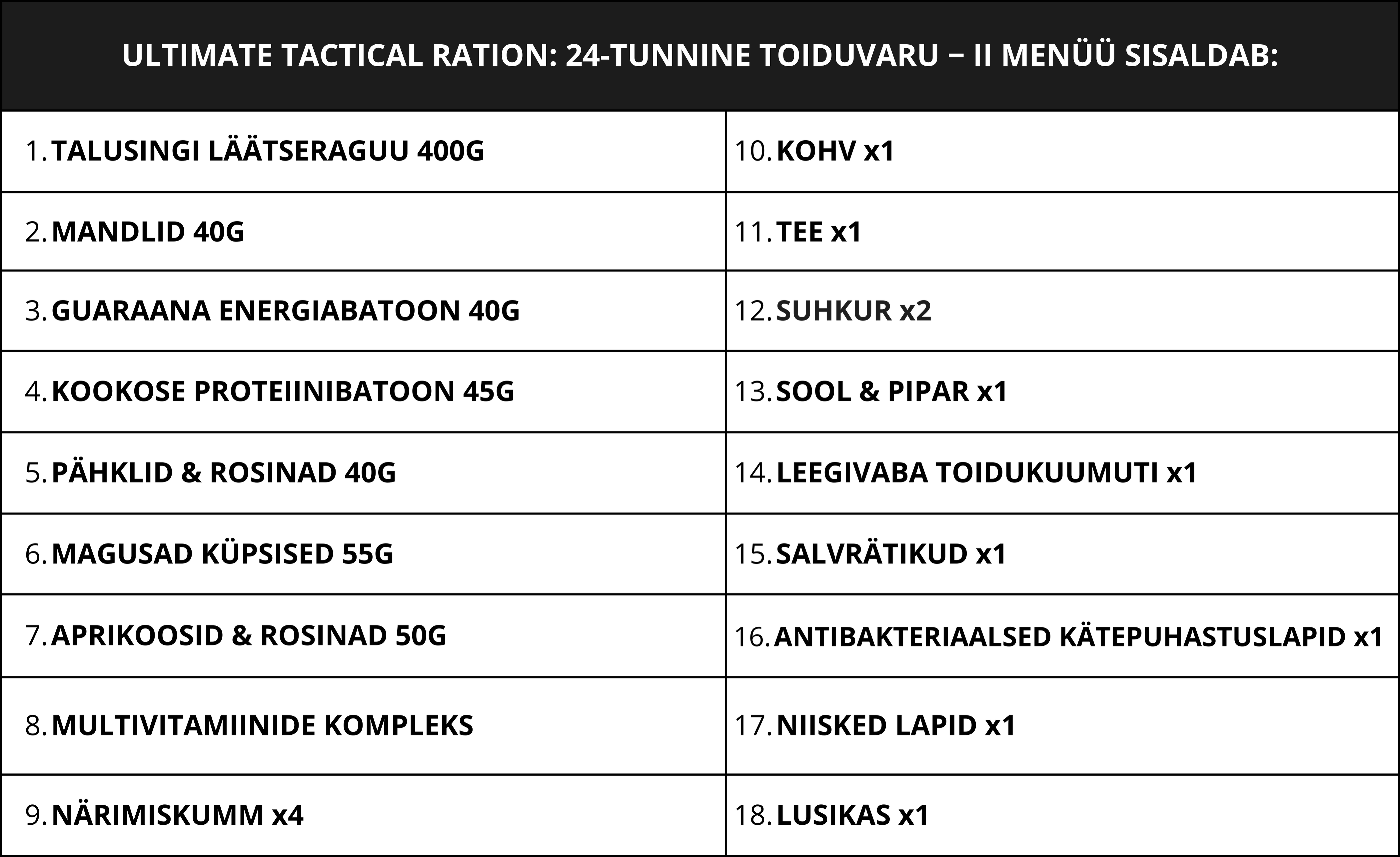 ULTIMATE TACTICAL RATION: POOLEPÄEVANE TOIDUVARU - MENÜÜ II