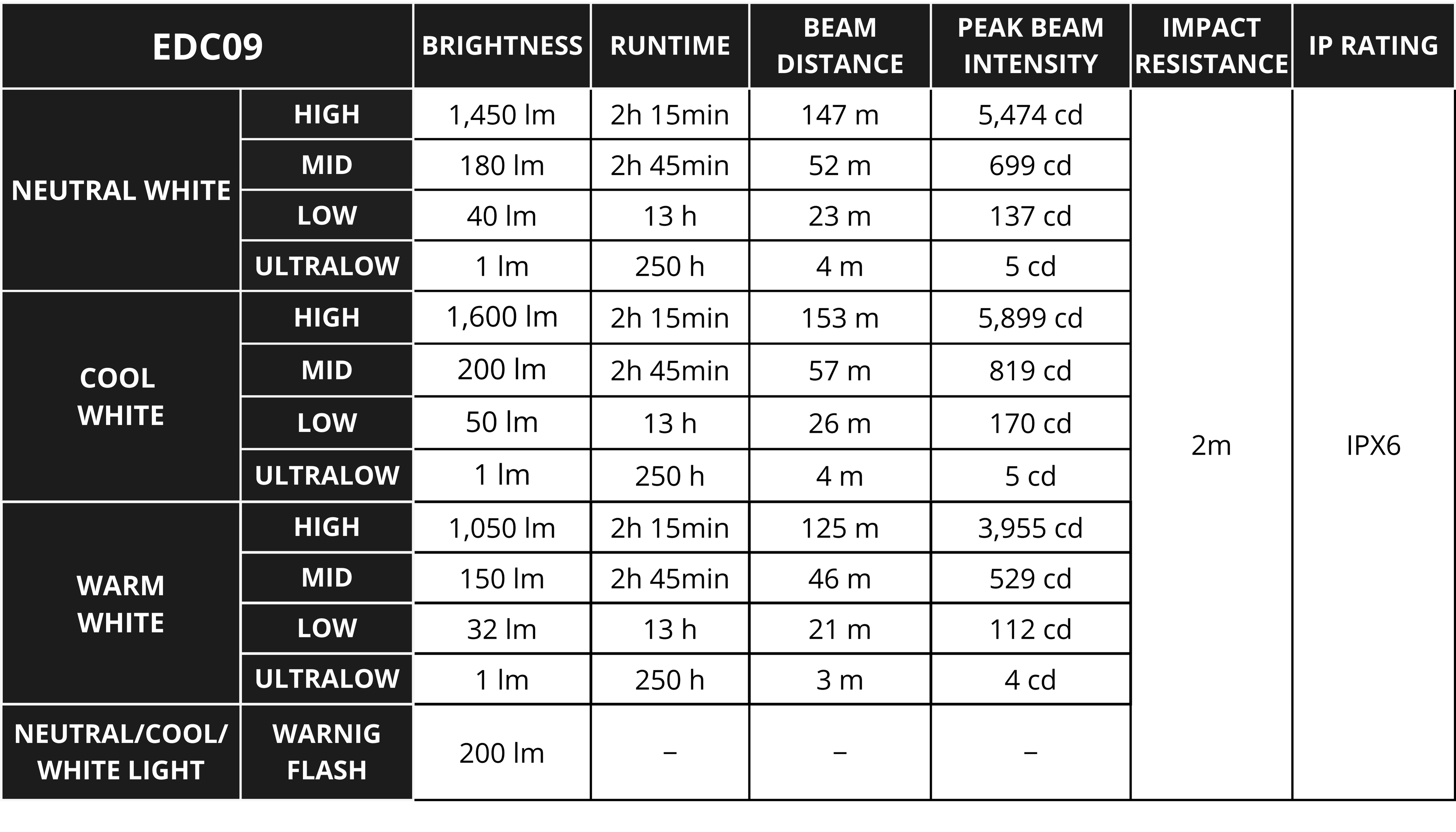 EDC09 is a compact EDC flashlight built for close-range, task-focused lighting. Dual quad-core MCT UHE LEDs deliver up to 1,600 lumens, with selectable cool, neutral or warm white output for different working conditions.