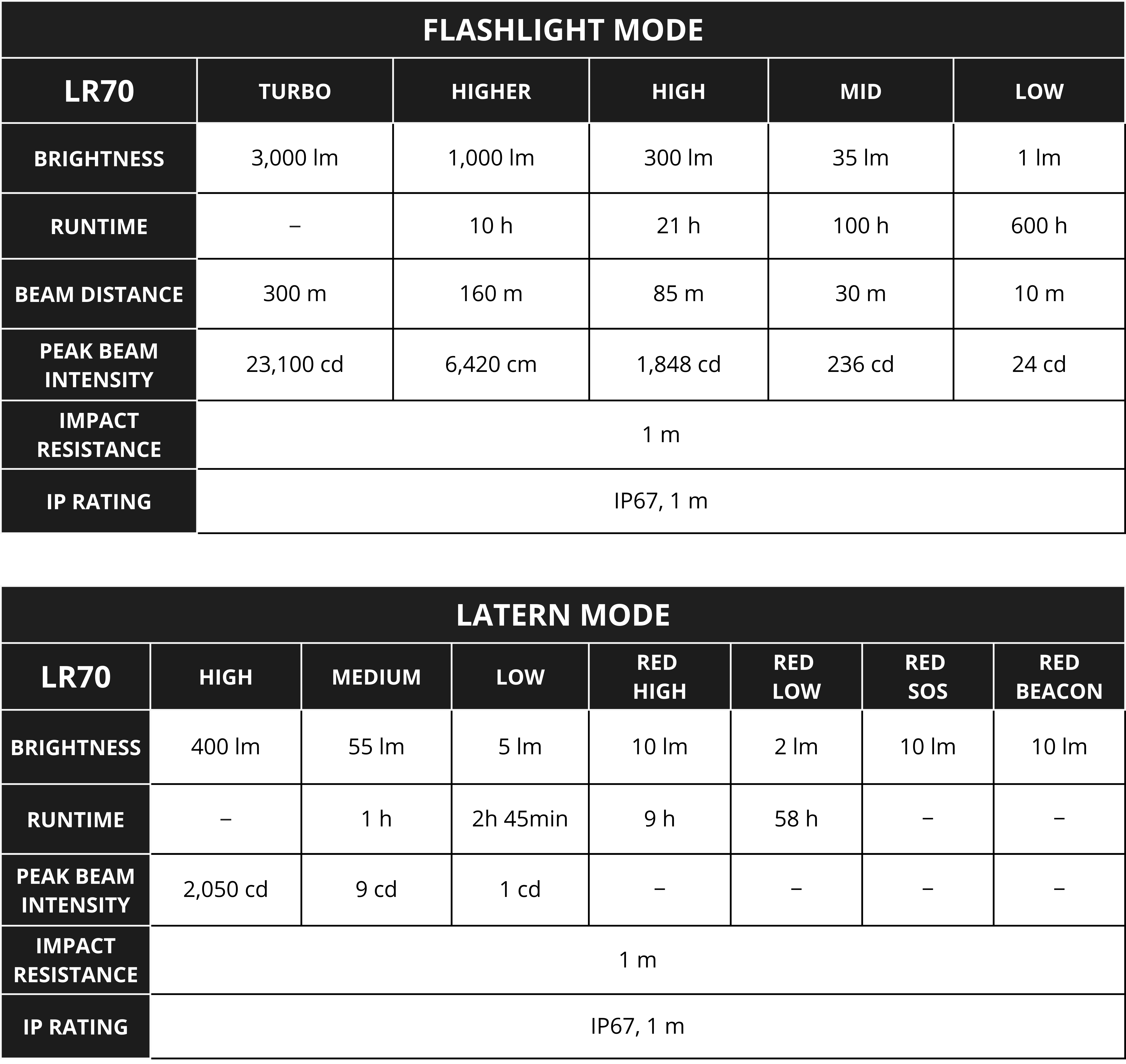 • Beam intensity: 23,100 cd (flashlight mode) / 70 cd (lantern mode);
