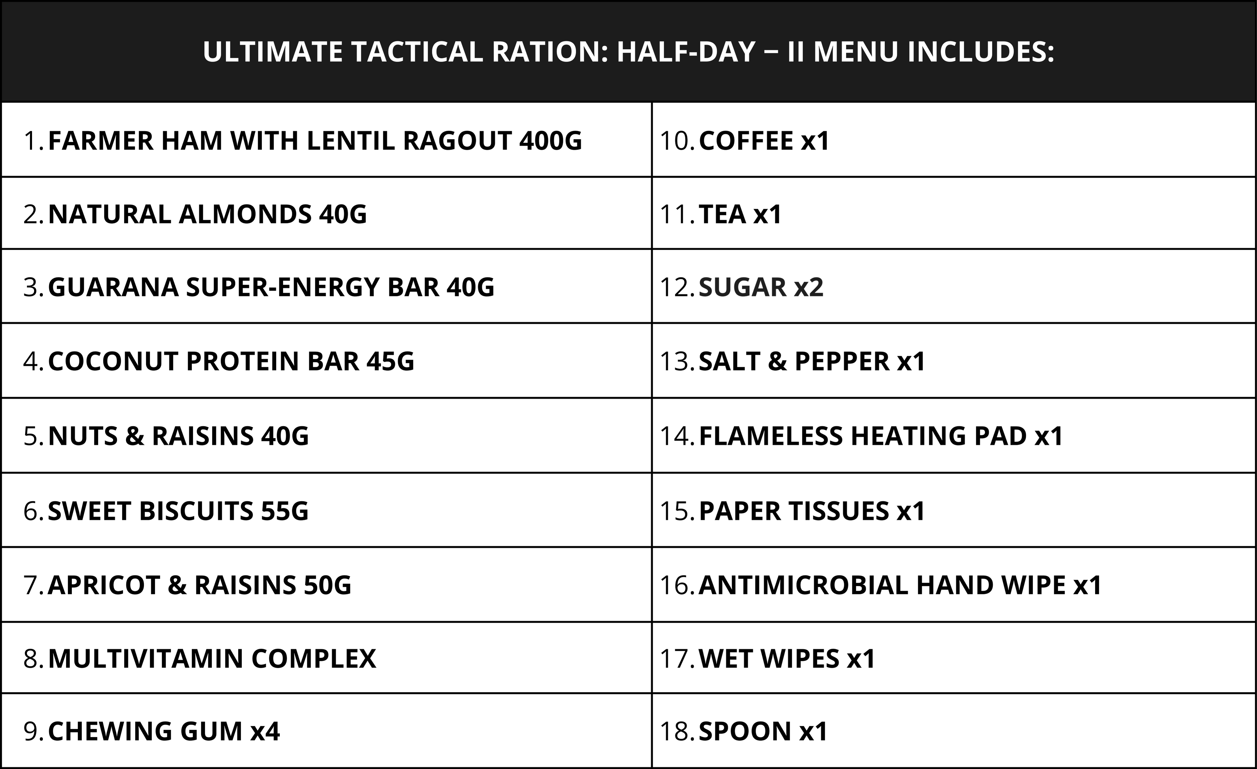 ULTIMATE TACTICAL RATION: HALF-DAY - MENU II