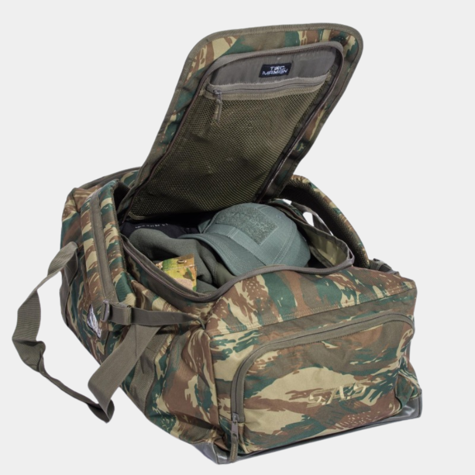 'SAS' duffle bag is a 45L all-purpose carry option built for duty, gym or travel. Designed with a spacious main compartment, internal toiletry pocket and dual side cargo pockets, it keeps your gear organized and accessible. Padded, adjustable shoulder straps ensure comfort on the go, while reinforced 450D webbing adds structure and load support.